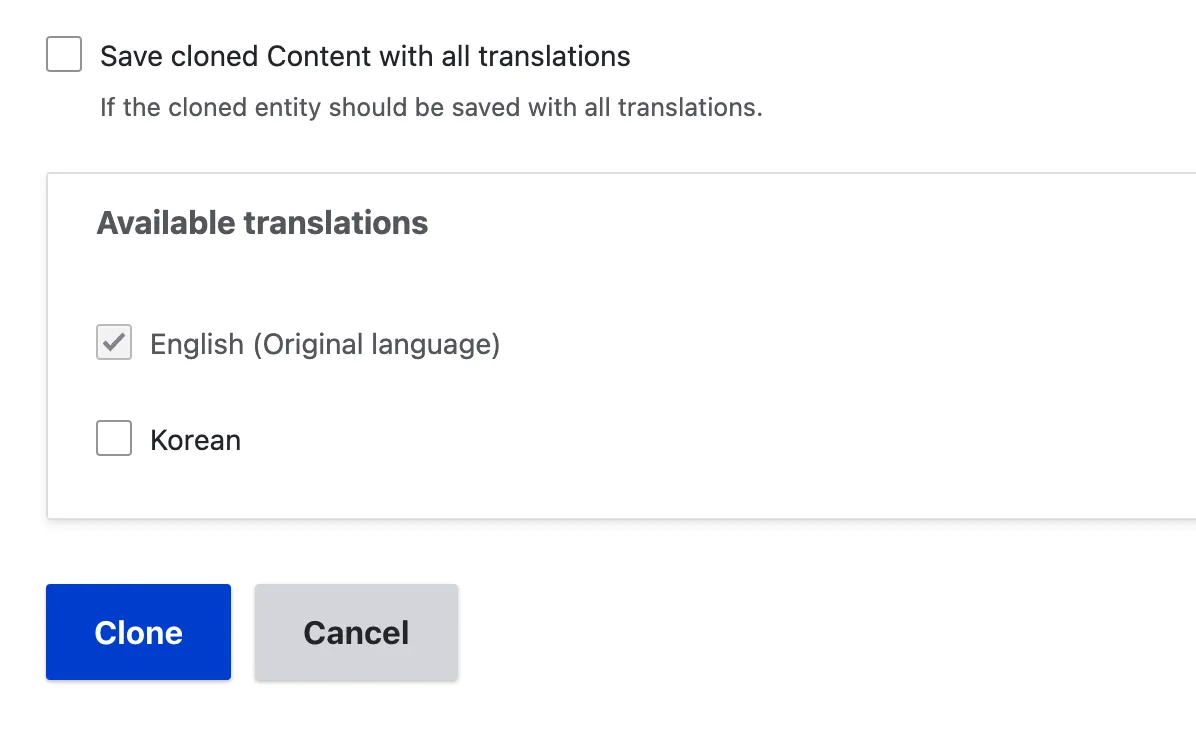 If translations are not required, clearing the checkbox will clone only the EN version and allow the editor to select which translations to include in the cloning process.