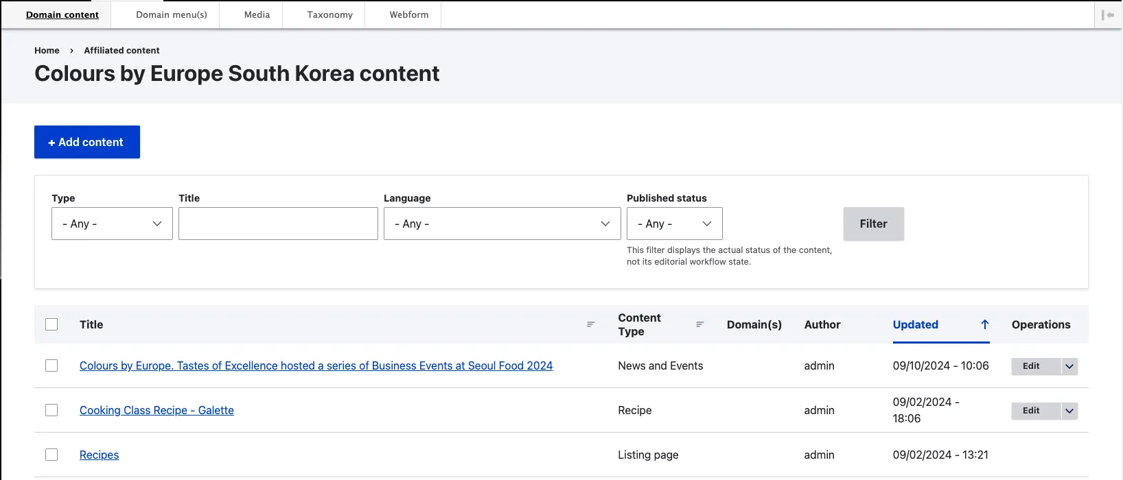 - This will take you to the content dashboard, where you can view all content already created for your country site.