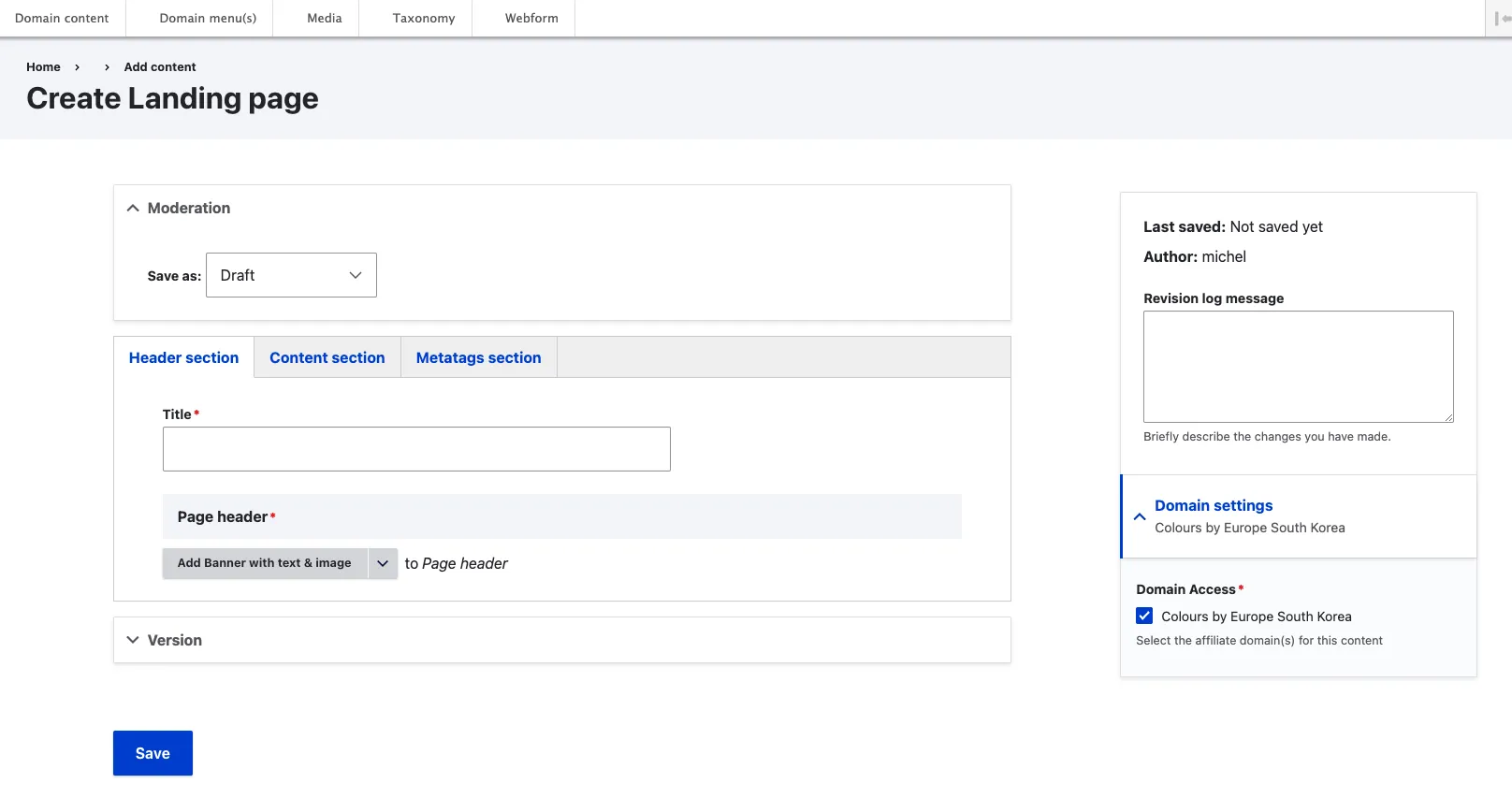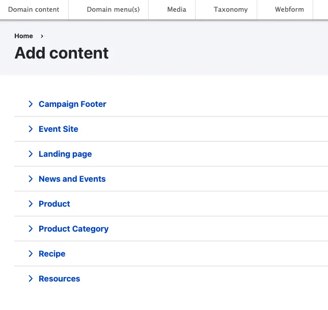- Select the content type you want to use for this content, for example “Landing page”