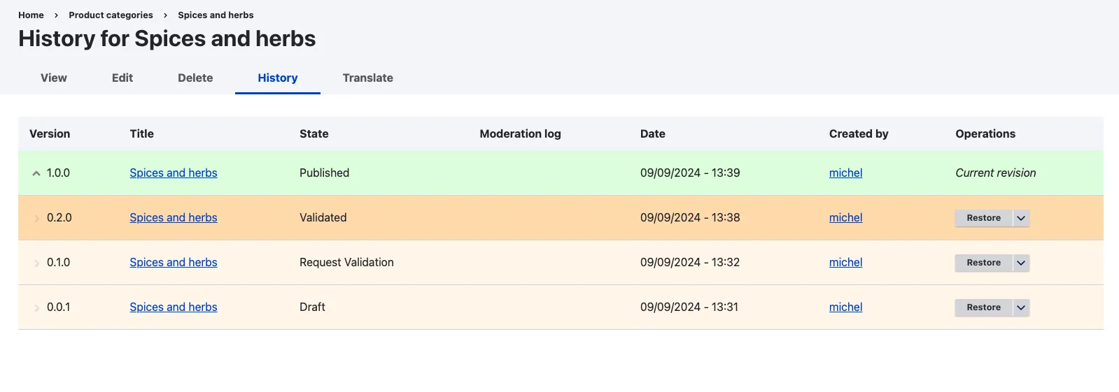 - Version Restoration: The ‘Restore’ link enables you to revert to a previous version of the content if needed.