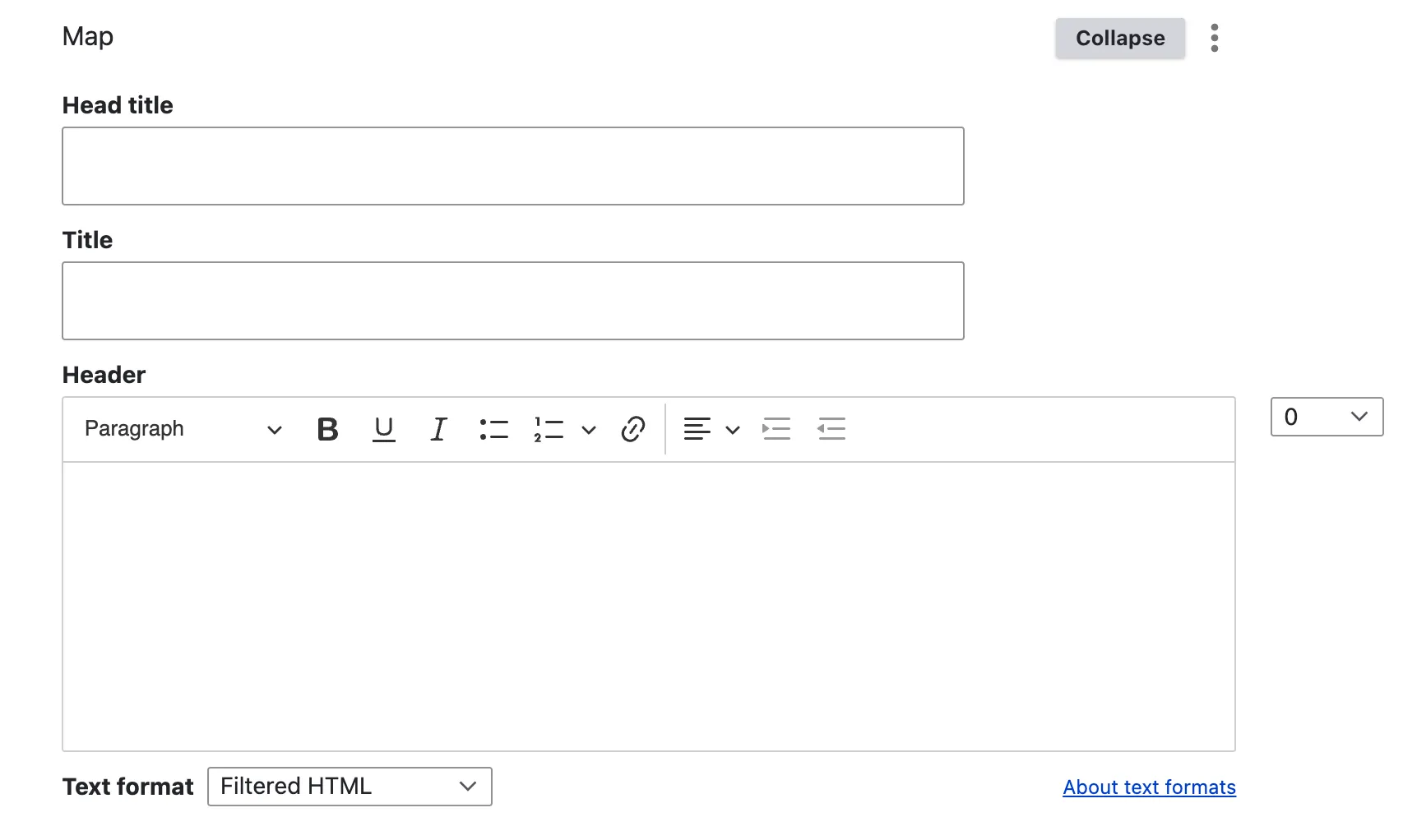 This is a simple form that allows you to add a title and body text to introduce the map. The map itself cannot be updated or modified by editors and serves the single purpose outlined above.