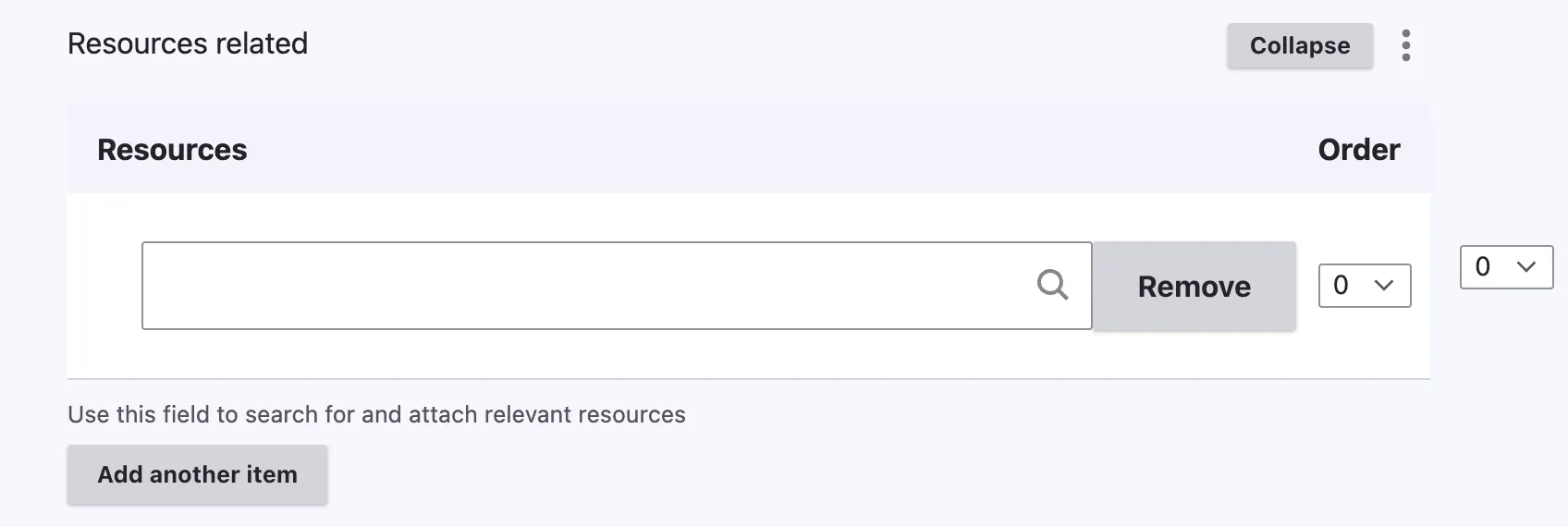 Type the title of the resource you wish to add to the page. More than one resource can be added by using the “Add Another Item” button.