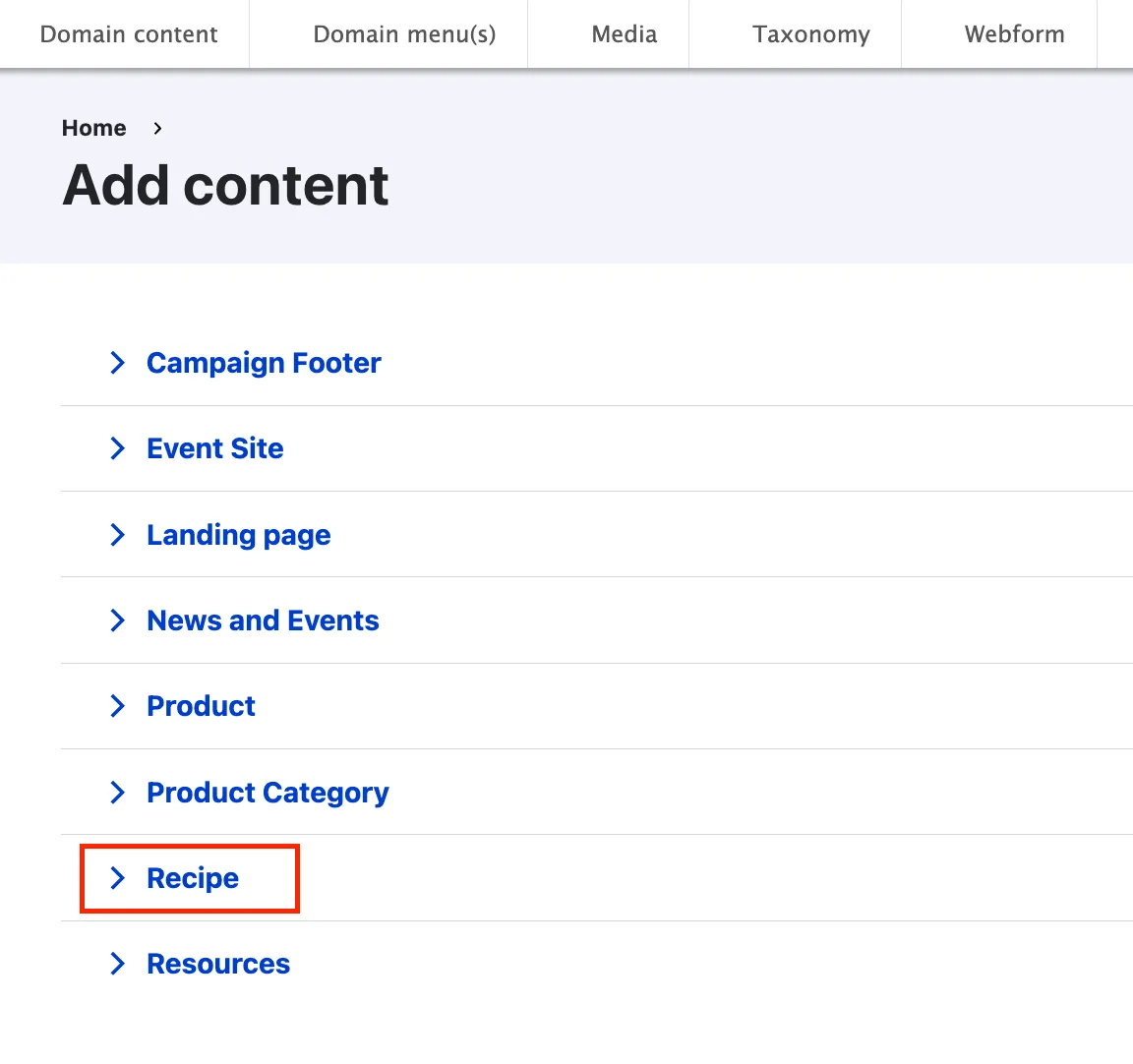 - Recipe content type