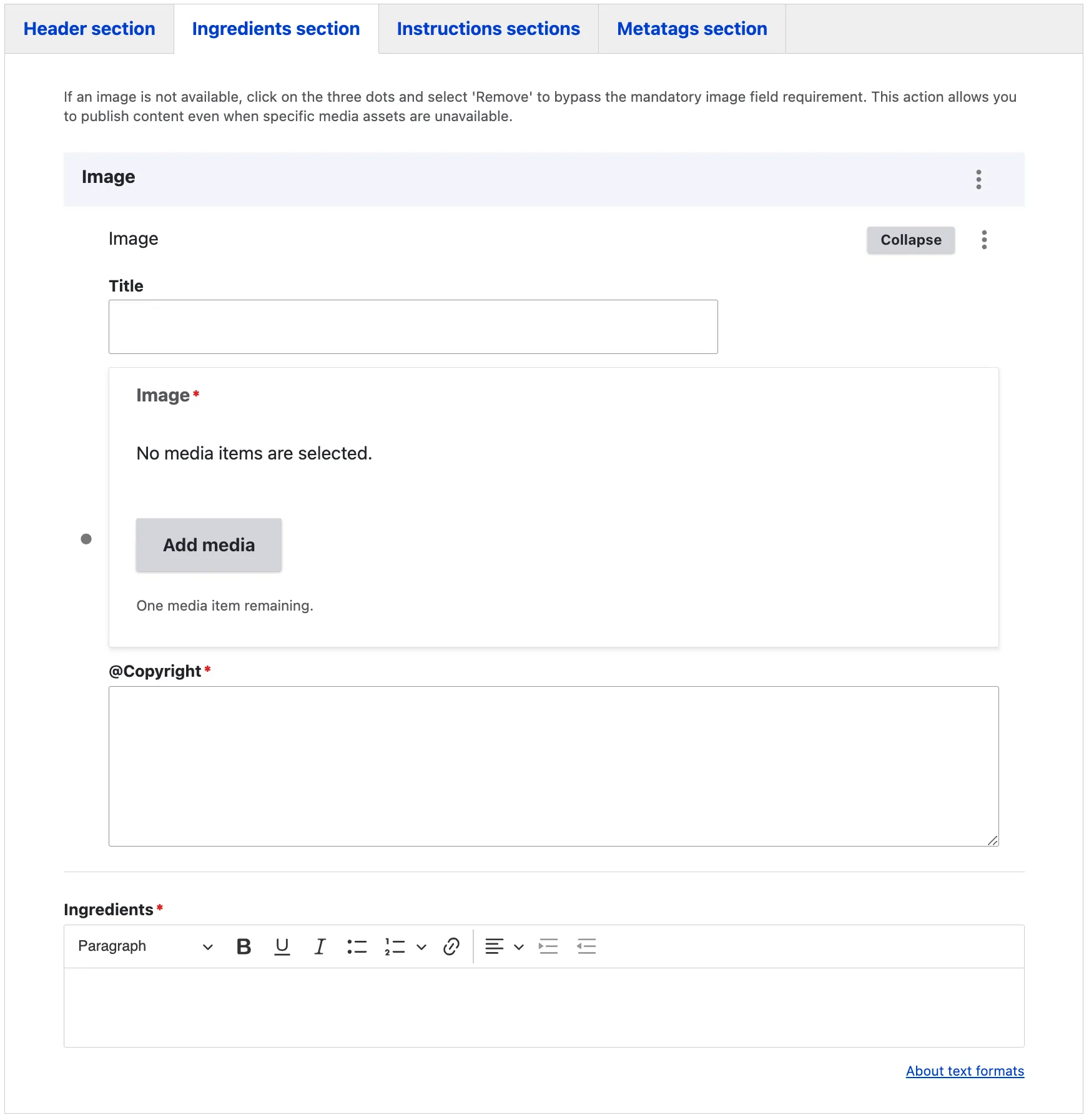 An image field is provided to add a visual element to the ingredients section. If no suitable image is available, you can click on the three dots and select ‘Remove’ to bypass the mandatory image field requirement. This option ensures you can publish the content even when media assets are not available.