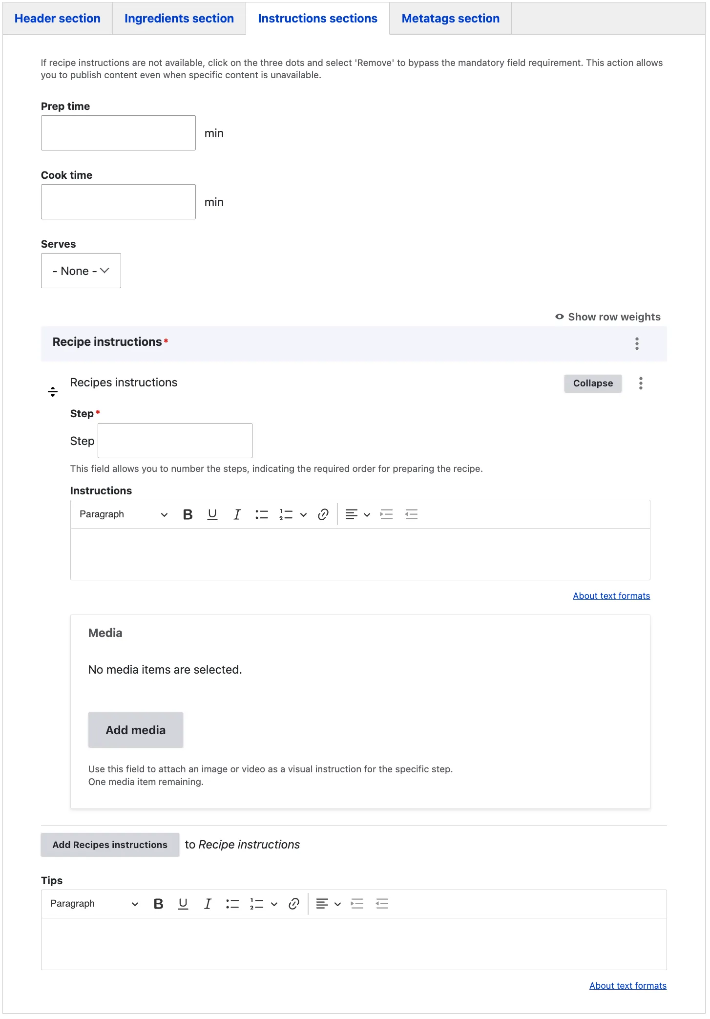 To add another step in the cooking process, click on Add Recipe Instructions to duplicate the instruction fields. If any tips or extra advice can assist the user in preparing the dish, they should be entered in the Tips field.