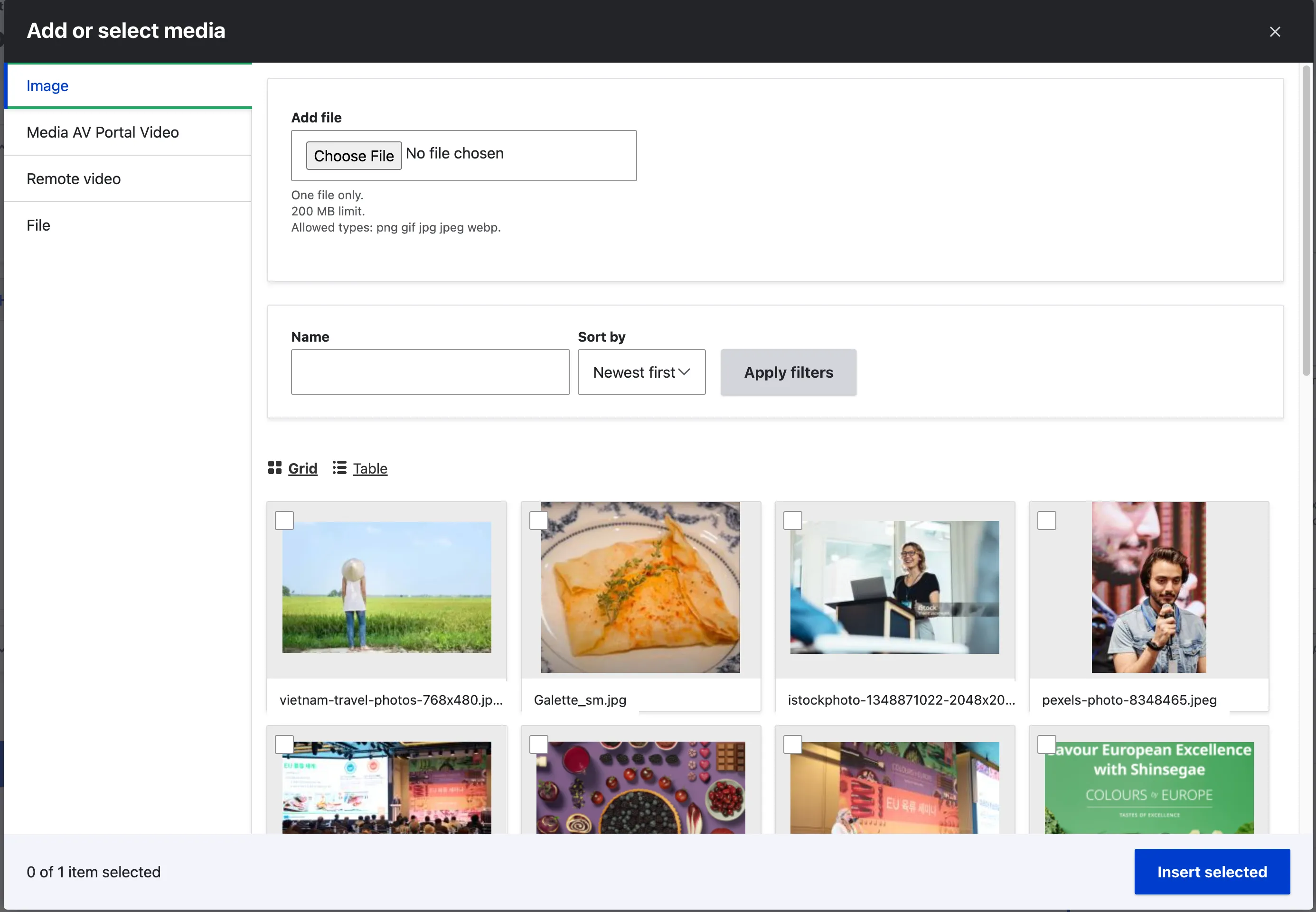 To add a new resource, editors can click the “Add” button, which opens a file browser window, allowing them to browse their computer’s filesystem to upload new media. Editors can also select from existing media by simply clicking the desired item.