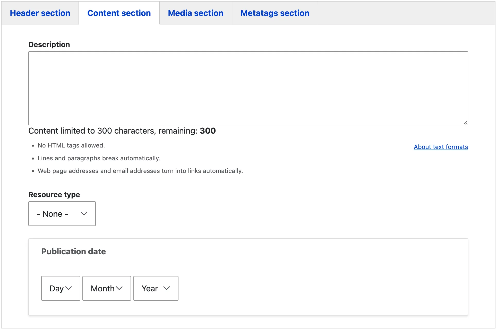 The content section tab contains fields for adding a descriptive text for the resource, which will be displayed on the listing page and other locations where the resource is referenced. The description is limited to 300 characters. Additionally, editors can tag the resource using the resource type, which helps classify it and is also used as a filter on the resource listing page.