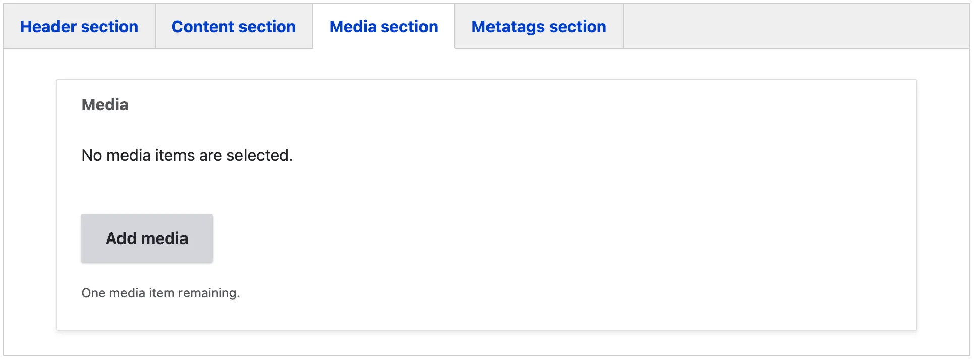 The media section allows editors to add the media itself. Clicking on the “Add Media” button will redirect to the media library interface, where the resource can be uploaded or selected.