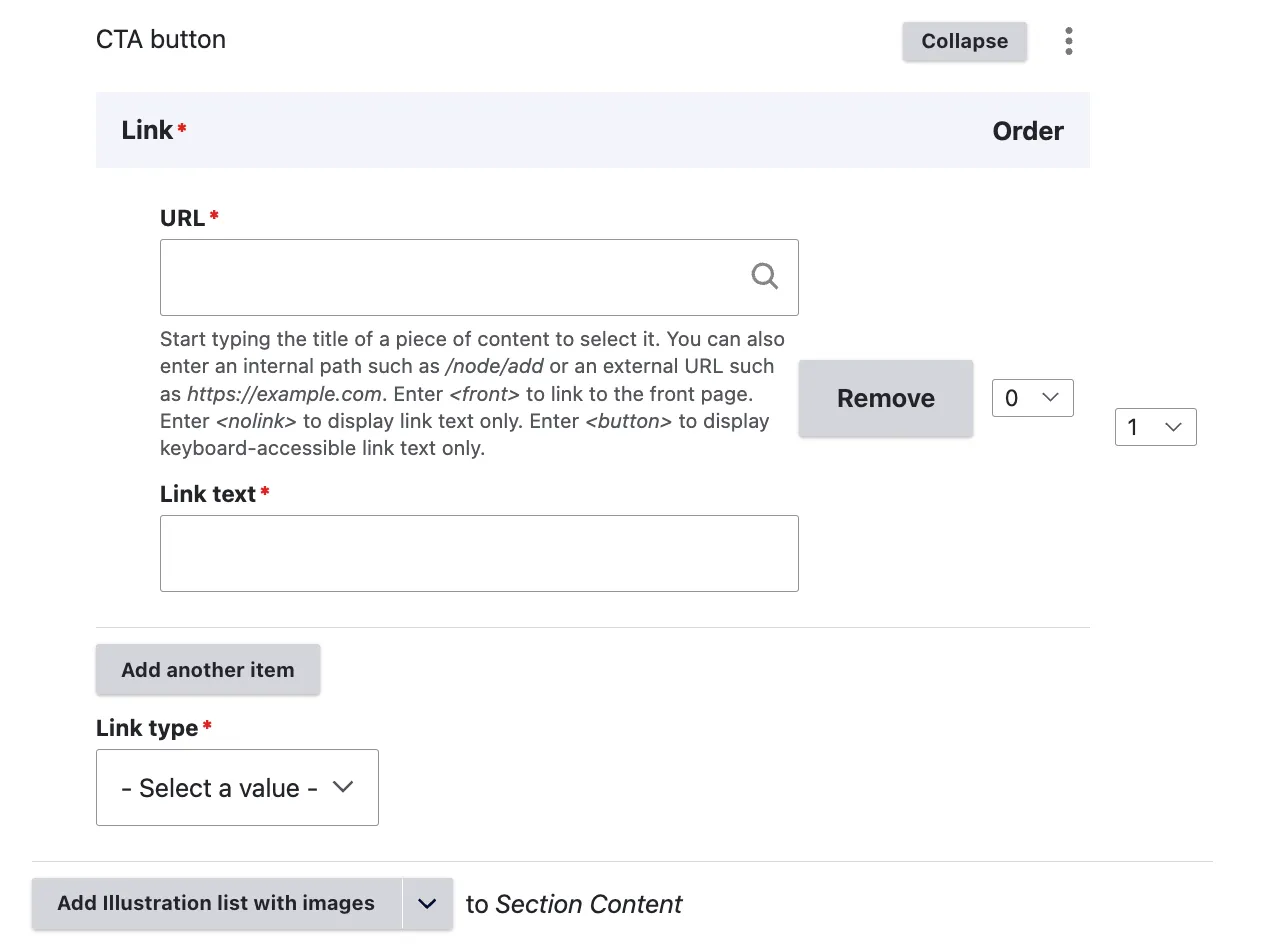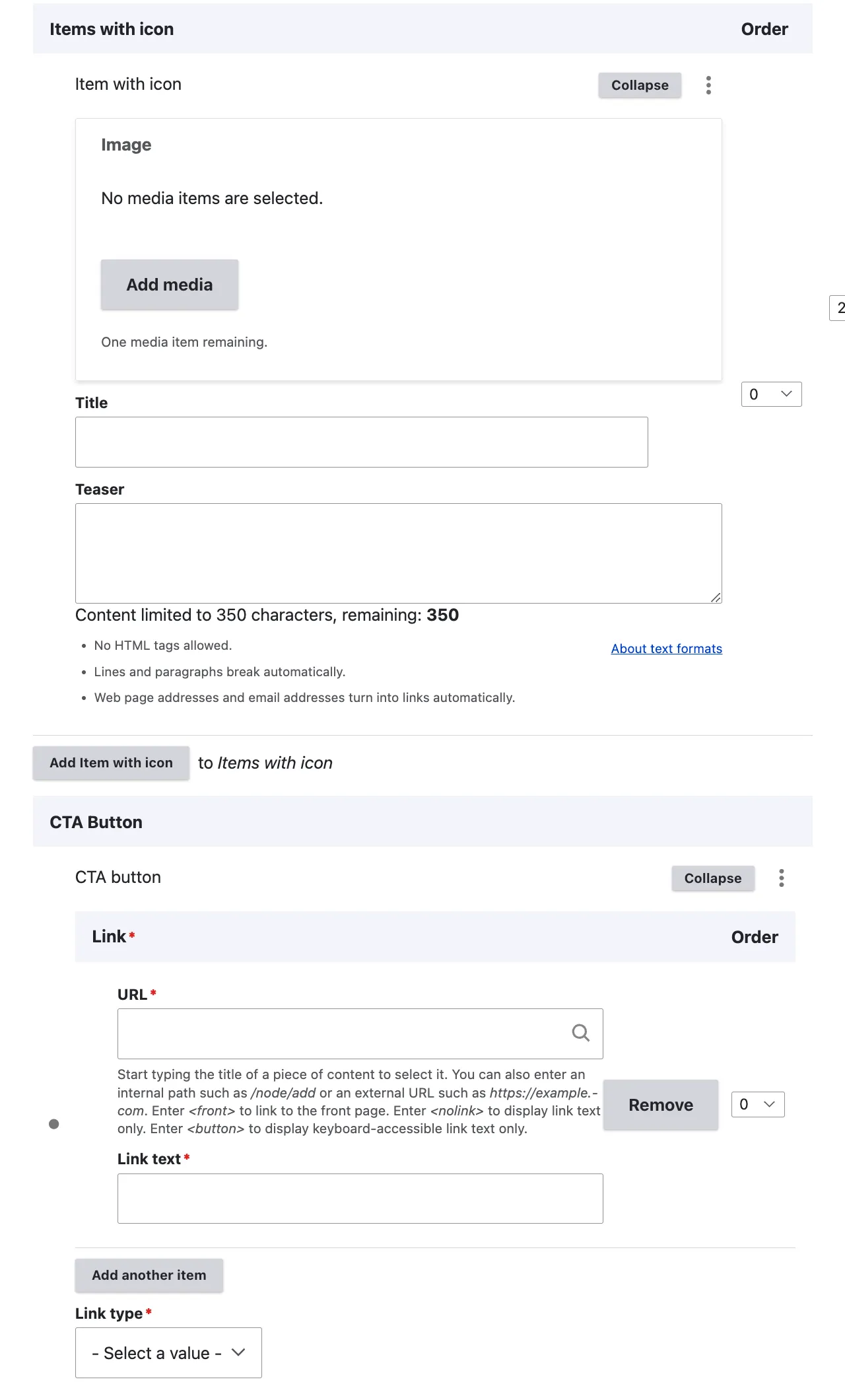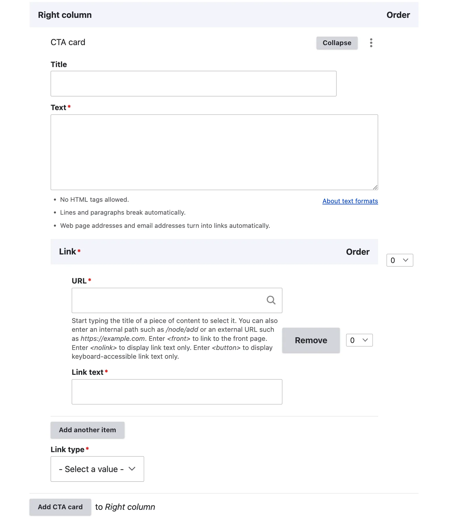 As indicated by the content item name, editors are restricted to adding only three entries per section. Additionally, a text link can be incorporated to connect to either internal or external content.