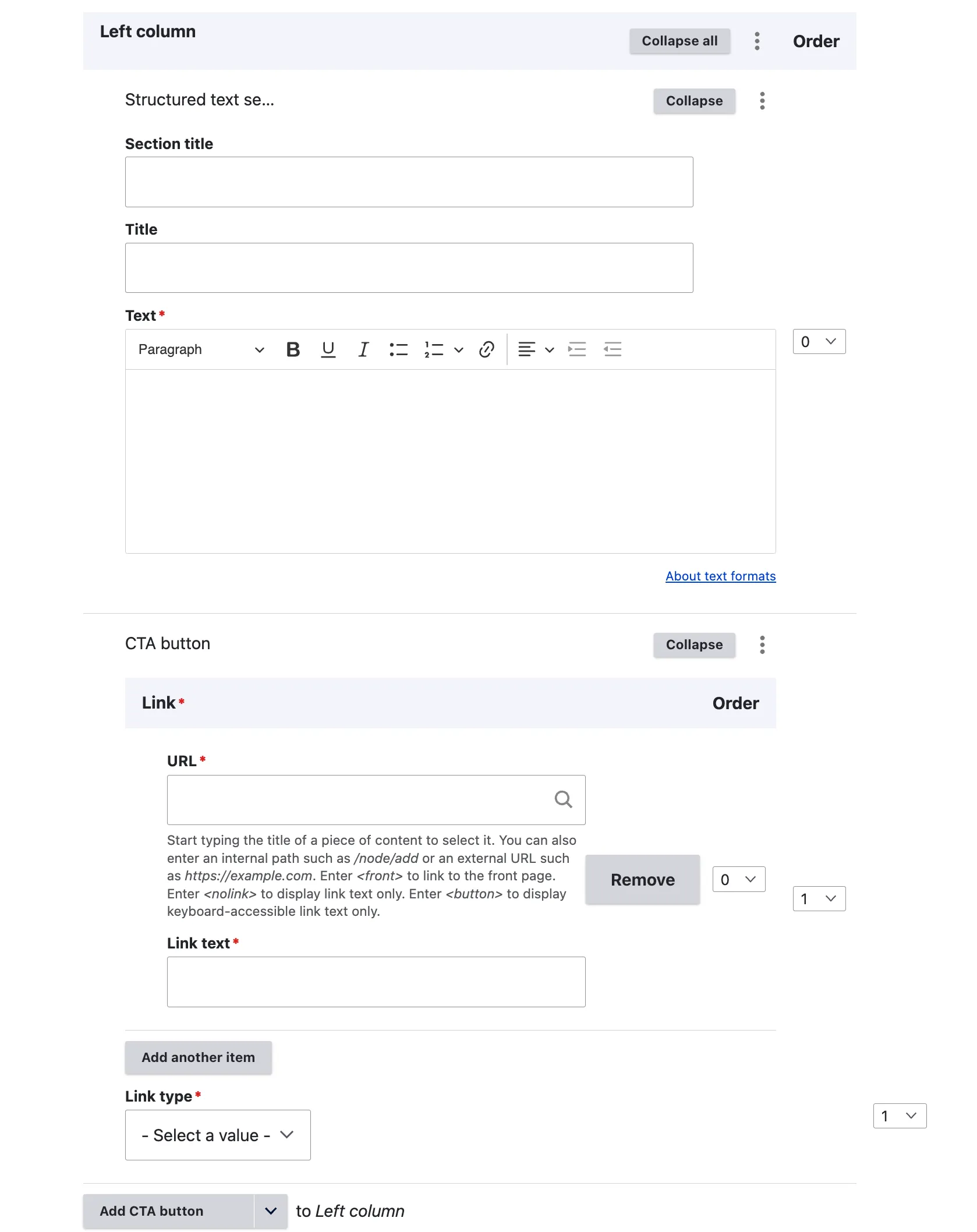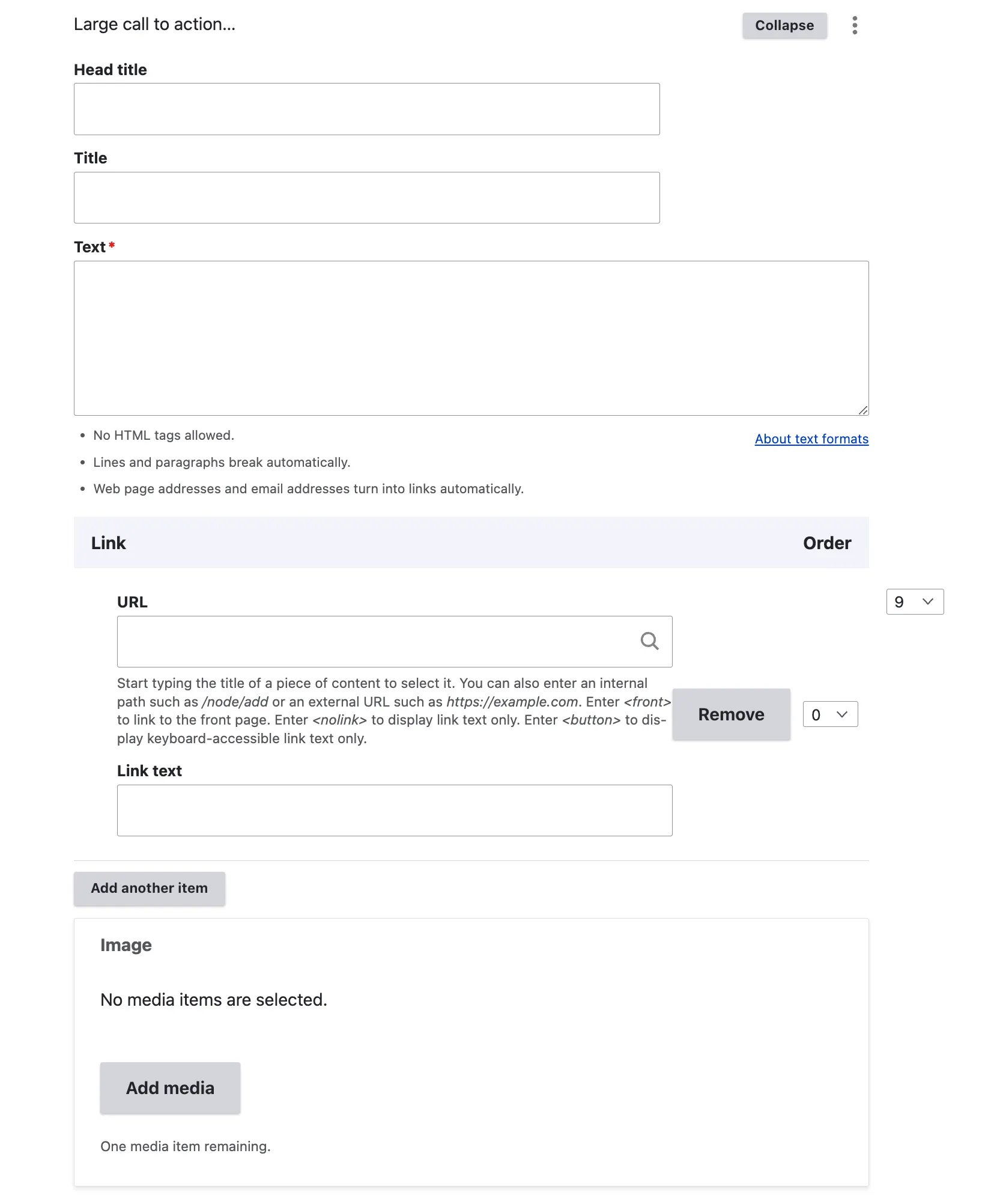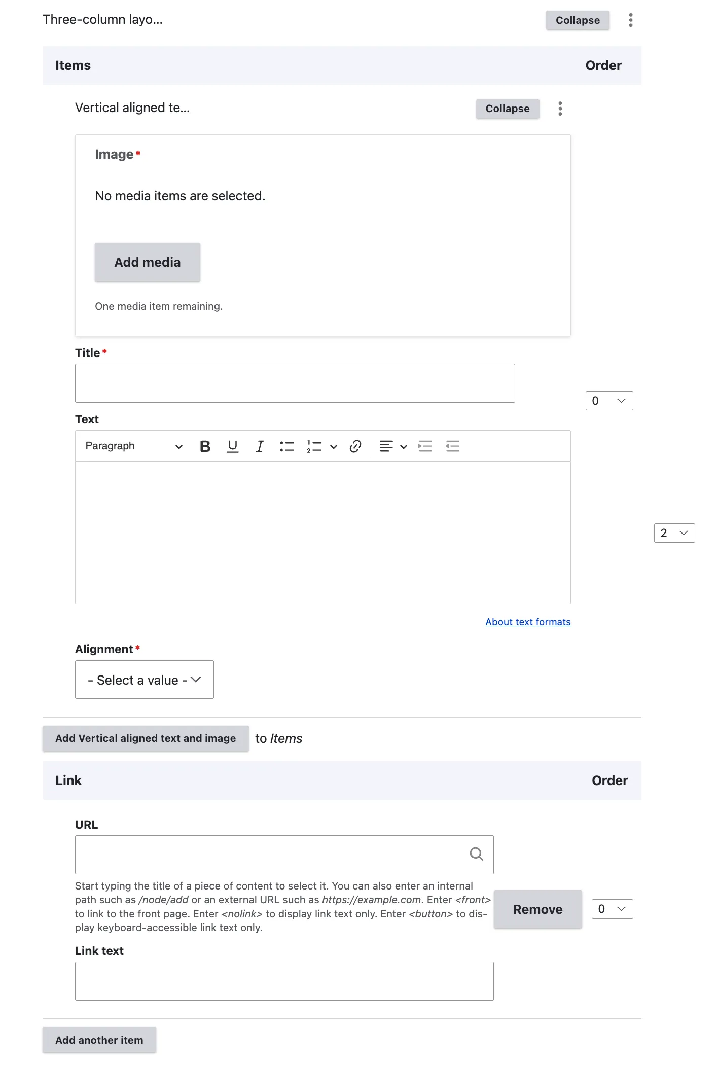 As indicated by the content item name, editors are restricted to adding only three entries per section. Additionally, a text link can be incorporated to connect to either internal or external content.