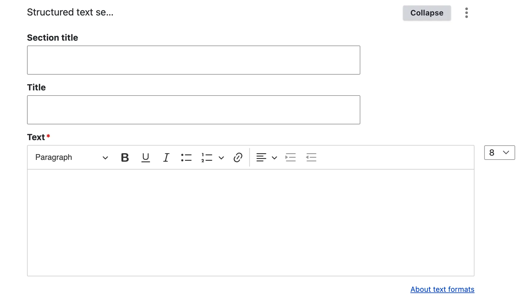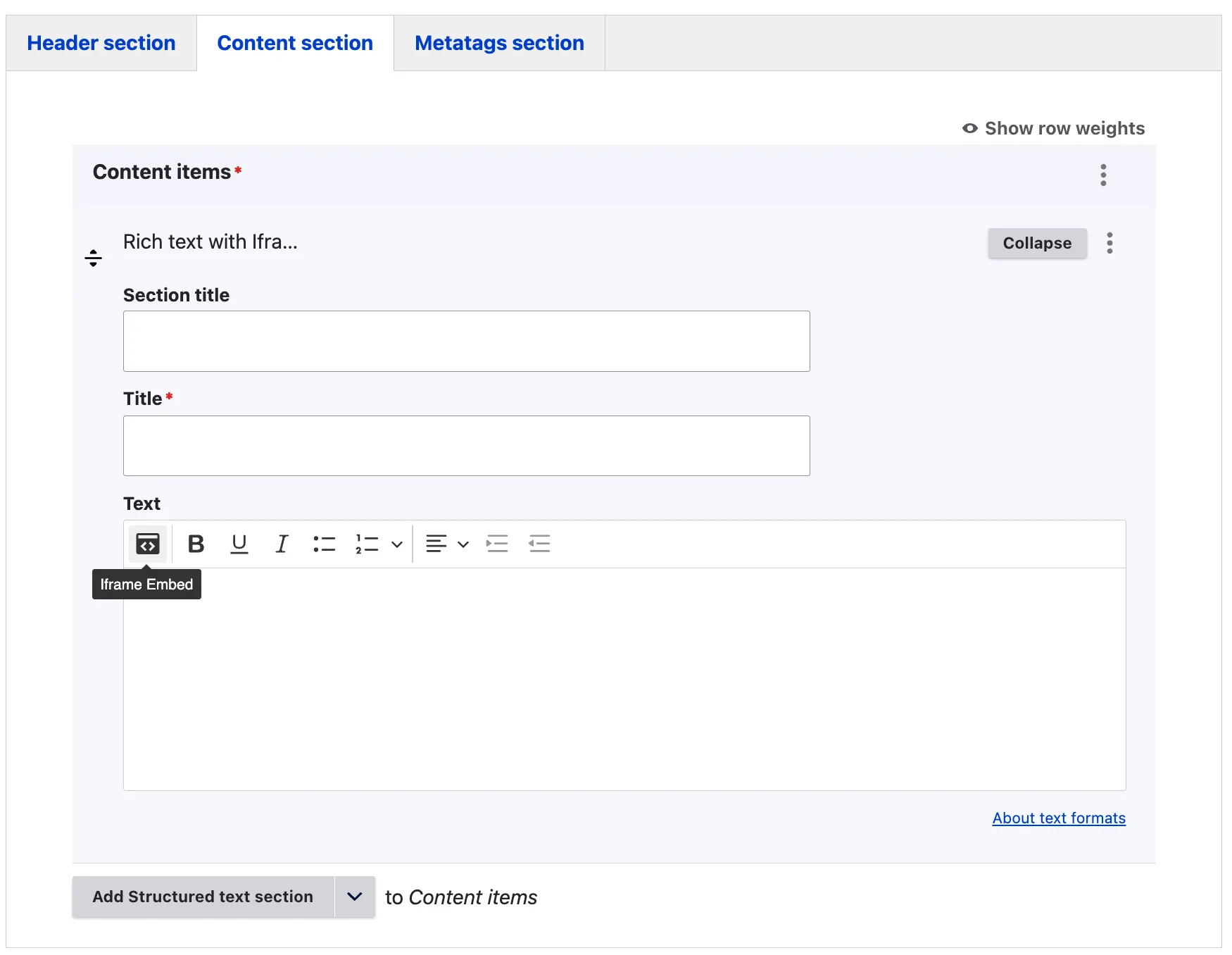 The ‘Structured Text Section’ is a rich text content item that enables editors to craft detailed paragraphs complete with a section title, an H2 paragraph title, and descriptive text. If additional sub-headers are required within the text, it is advisable to incorporate them using the heading options available in the WYSIWYG editor. For creating distinct sections, it is recommended to start each new content item with an H2 title, ensuring clear hierarchy and readability in your content structure.