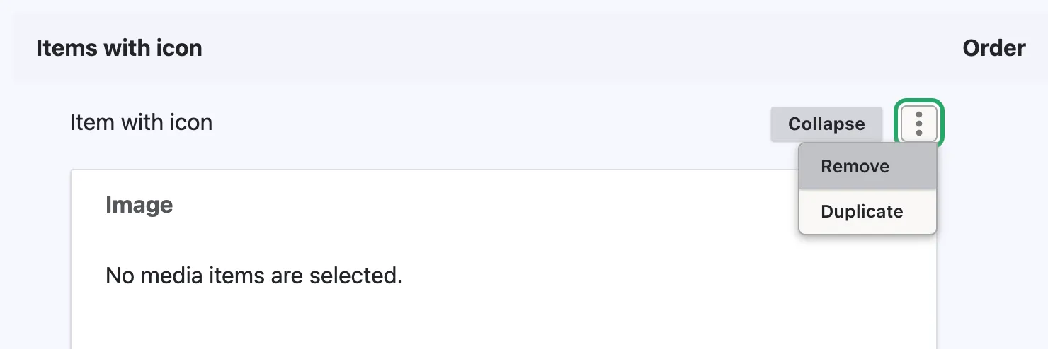 Note on toggle off element In case the learn more section is not required the editor must actively remove the entire items with icon section to ensure no residual visual element is displayed on the page. This can be achieved by clicking the 3 buttons menu and selecting remove